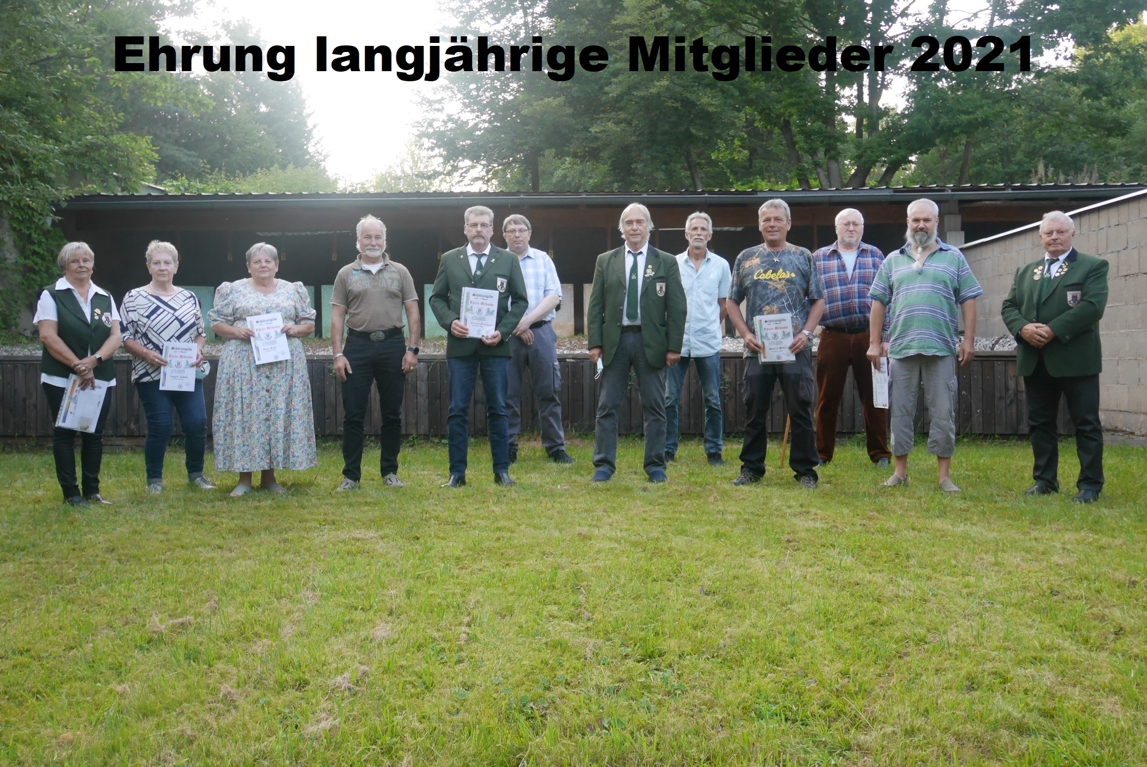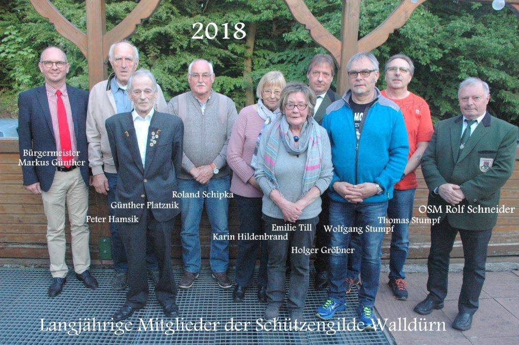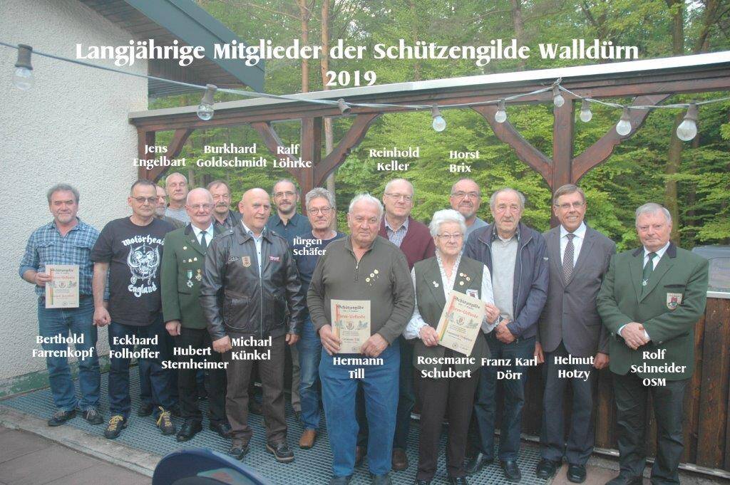 15 Jahre: Reinhold Keller, Thomas Roderus, Harald Scheuermann und Willi Stahl; 20 Jahre: Monika und Walter Jucht, Walter Jucht jun., Matthias Spielvogel und Johann Trenner; 25 Jahre: Michael Fraske, Peter Löhr und Sven Lurz; 30 Jahre: Elmar Baumann und Dieter Weissinger; 35 Jahre: Tobias Folhoffer, Thomas und Wolfgang Niemes, Richard Rottler; 40 Jahre: Herbert Meixner und Thomas Trunk; 45 Jahre: Volker Stübs und Siegfried Wartha; 50 Jahre: Dieter Breunig und Josef Gerold; 60 Jahre: Josef Neid. Eine Sonderehrung übernahm Roger Höly: Als „gute Seele der Schützengilde“ würdigte er Brigitte Schneider mit einem geschmackvollen Blumengruß. Ein Dank galt auch Reimund Schlipf für die Gestaltung der Urkunden.